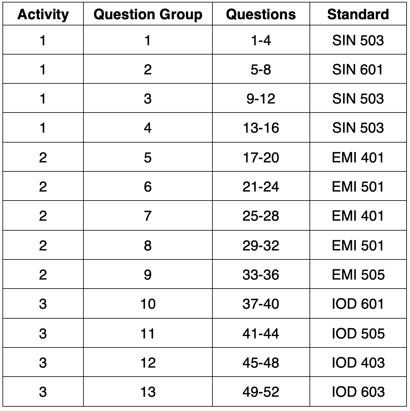 While the Concave Mirrors activity addresses the two NextGen Science and Engineering Practices and the two Crosscutting Concepts above, the activity drew its greatest inspiration from ACT's College Readiness Standards for Science Reasoning. The activity consists of 52 questions organized into 13 Question Groups that are spread across the three difficulty levels. All three strands (Interpretation of Data - IOD; Science Investigation - SIN; and Evaluation of Models, Inferences, and Experimental Results - EMI) of the College Readiness Standards are addressed in this activity. The code given for the standard includes three letters to indicate the strand and three numbers to indicate the specific standard within that strand. Higher numbers are indicative of more complex science reasoning skills. The relationship between the questions and the standards is as follows: